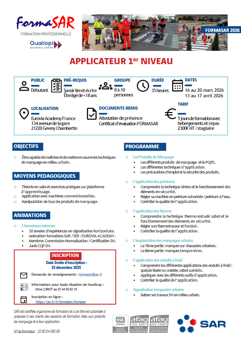 Avec ce label, gage de qualité, nous proposons à nos clients des sessions de formation ayant trait aux produits de marquage et à leur application. Les formateurs sont salariés de SAR et disposent d’une grande expérience dans la chimie des produits, la règlementation en vigueur, la certification des produits et leur application dans les différentes techniques de marquage. Nos modules de formation couvrent l’ensemble des domaines liés aux produits de marquage routiers et reçoivent chaque année de nombreux applicateurs de conseils de départementaux, de services techniques des mairies ou de sociétés de marquage.
